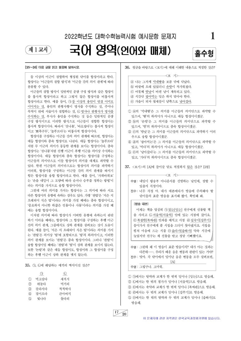 2022 수능 예시문항 국어 답지, 2022학년도 수능 예시문항 국어 수학 문제지와 답지 오르비
