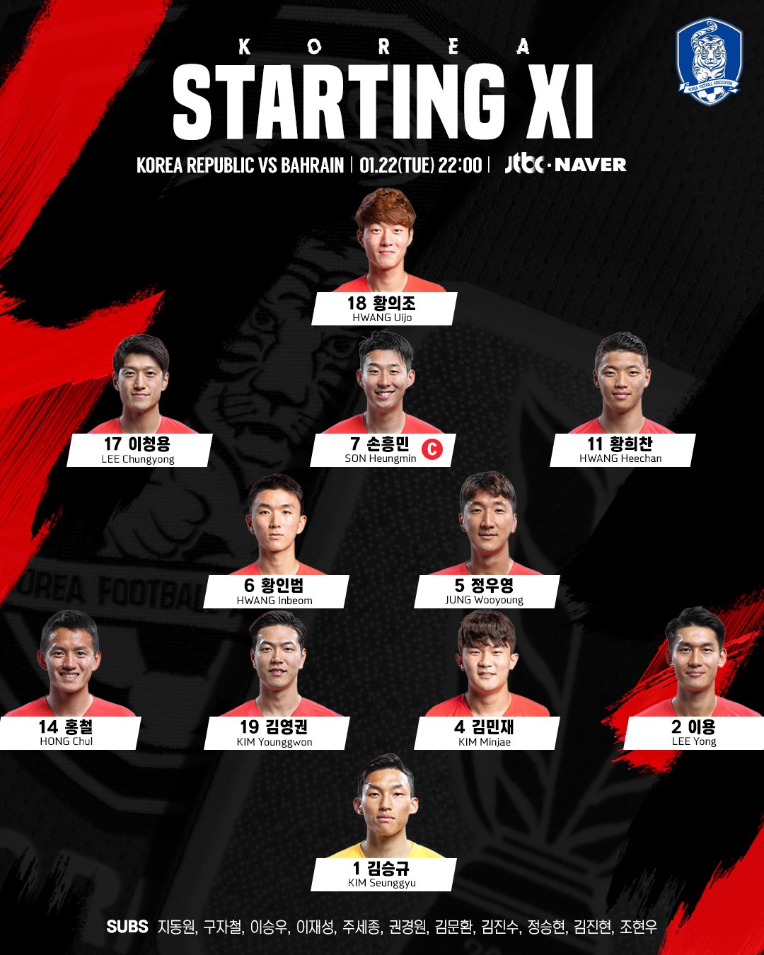 대한축구협회 Kfa No Twitter 태극전사 거침없이 레인 위를 달려라 2019 Afc 아시안컵 조별리그 16강전 바레인전 축구 국가대표팀의 선발라인업을 공개합니다 V 바레인1 22 화 22 00 Jtbc Naver 한국시간 기준 아시안컵 Asiancup2019